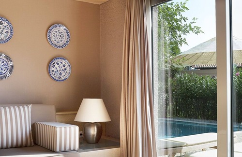 The two bedrooms are equally seductive and stylish (one double and one twin room), with plenty of holiday wardrobe space, and there’s a fully-equipped kitchen with an oven and a microwave should you wish to dine in. You can also relax in the lounge on the comfortable sofa, with doors leading straight out onto your pool terrace, flooding the villa with natural light. Extra thoughtful features include Wi-Fi, complimentary daily water and a safety deposit box.