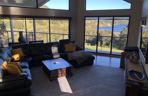 The open plan living areas boast cathedral ceilings, large leather lounge, wall mounted plasma tv, Blue Ray player, 100's of DVD's/Blue Rays for you to enjoy and not forgetting the large windows that frame the stunning views. Even the office desk has an amazing view.
