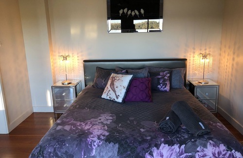 This open plan home has 2 king bed suites, both with those magnificent views. The bedrooms are spacious with king size beds, ceiling fans and their own TV for those cosy nights. Each bedroom has it's own bathroom. One has a huge bath big enough for 2 so you can enjoy romantic nights watching the stars whilst sipping champagne.