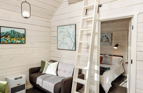 Chalet Style Micro Cabins are perfect for your special trip to Alaska and just big enough for 2. These petite cabins feature a living room with a petite couch, chair, and Murphy table. A kitchenette completely outfitted for your travel cooking needs with silverware, pots & pans, culinary tools, basic spices and of course, an in-cabin coffee maker. Stovetop burners, microwave and mini fridge are also available to cook up whatever you need. Bathroom includes a shower, toilet & sink. Finally, the bedroom has a queen bed with built-in closet space and a loft to curl up with a good book.