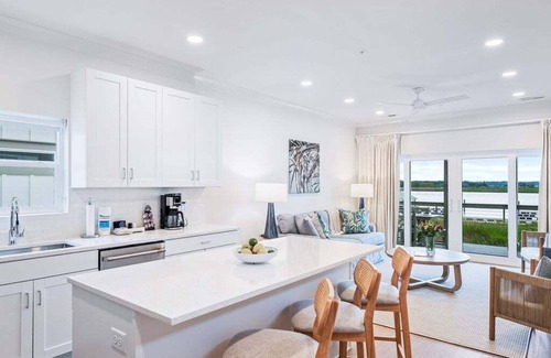 DETAILS: Winyah Bay Club features 17 stylish, individual cottage units, each ideal for large wedding parties, golf enthusiasts, and families. This cottage offers two spacious bedrooms, two and a half baths, and a master suite with breathtaking water views. The open-plan living room, kitchen, and dining area on the second floor are designed to maximize the stunning waterfront vistas, making every stay memorable and luxurious.