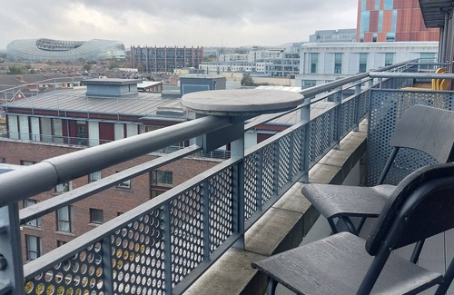 With balconies on both sides, enjoy vibrant views of the bustling dock on one side and the iconic Aviva Stadium on the other.