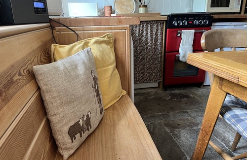 Amenities: Electric oven and hob, microwave, fridge, washing machine, dishwasher, coffee maker, kettle, toaster. Wifi. Fuel, power, and starter pack for woodburning stove inc. in rent. Bed linen and towels inc. in rent. Roadside parking. Private garden with table and chairs. Sorry, no pets and no smoking. Shop 0.3 miles, pub 1.2 miles, river 0.1 miles. Note: Property not suitable for small children