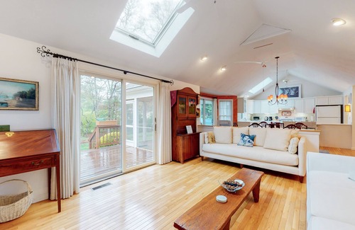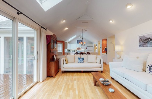 Enjoy a peaceful Cape Cod getaway at this adorable Osterville home. Within easy reach of the beach and town, this two-bedroom retreat boasts a private deck complete with a gas grill and screened patio area furnished for outdoor dining. The bright and inviting living area comes well-furnished for contemporary guest comfort, featuring natural skylights and an open layout welcoming group gatherings. Guests will find a full kitchen equipped with all the major appliances and counter gadgets for home-cooking convenience, plus a washer/dryer for easy cleanup. In the evenings, unwind by the living room fireplace while streaming shows and movies on the wall-mounted smart TV. After trips to the beach, rinse-off sandy feet and beach gear in the handy outdoor shower.