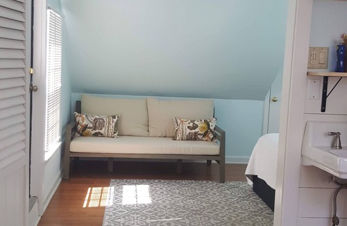 Quiet, private setting in Cotuit with private outside entrance. 1 bedroom with sliding hand crafted barn door, 1 queen bed in bedroom, 2 real twin mattresses in trundle bed, living/kitchenette area, Sunny, clean and sanitized Cape Cod 2 rooms 450 sq feet studio with full private bath and private, separate entrance and small kitchenette. Perfect for couples, with or without children but sleeps 4. Located above our garage with a large fenced in yard for dogs and kids with grill, swing set, private balcony and off road parking area. Please note if you're bringing your dog there is a spot to add in reservation. If not it will be 10.00 per night per dog to be paid at property in cash. Please send along dogs vaccine record.