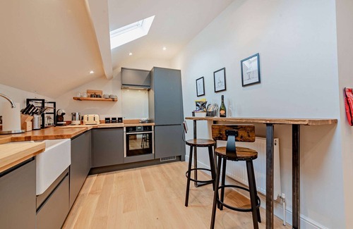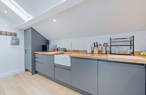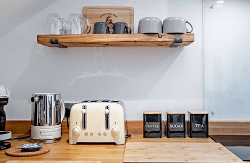 Electric oven, induction hob, Belfast sink, fridge/freezer, dishwasher, washing machine/tumble dryer, microwave, kettle, toaster, Dolce Gusto coffee machine (starter supply of pods provided), breakfast bar with two stools, iron and ironing board