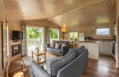 Each lodge offers a generous living space with an open-plan, fully equipped kitchen featuring a large island and full-size appliances. The spacious living area includes two large sofas, a Smart TV, and a log burner, while the dining area boasts a large family table with lovely views over the terrace.