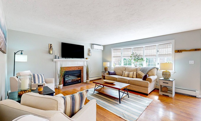 This two-story home was designed for stress-free trips to the Cape, easily accessible just nine miles past the Bourne Bridge. Meet up with the Shining Sea Bikeway Northern Trailhead half a mile from your door, bring along the provided chairs and towels on beach days, and take scenic ferry trips to Nantucket or Martha's Vineyard from Woods Hole (12 miles).