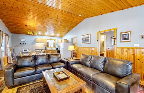 Inside, rustic charm and modern convenience create an idyllic resting pad. The living room boasts comfortable leather seating and a large TV, whereas the well-equipped kitchen has all the necessities you'll need to prepare your favorite meals.