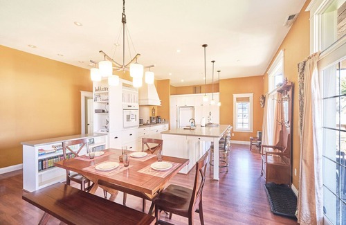 • The dining room seats 4, with four extra chairs at the kitchen island