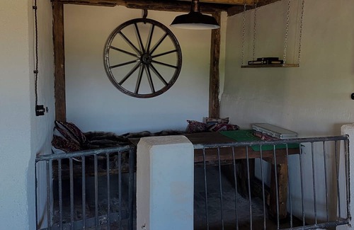 Po drugiej stronie — zamknięty bar w starej stajni, z kominkiem, przestrzenią do biesiadowania lub noclegu i widokiem na konie.