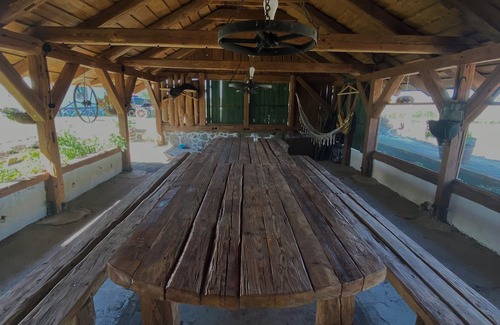 Obok domu czeka wiata biesiadna, dawna obora, z kamiennym grillem i stołem na wielką kolację pod chmurą.