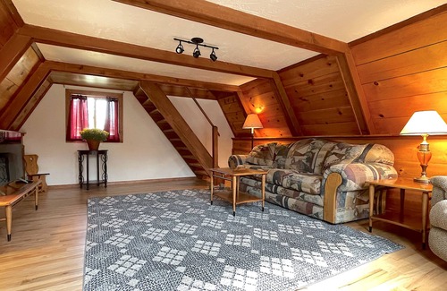 The A-frame home itself offers two bedrooms and one bath and a fully equipped kitchen! The first bedroom offers a queen size bed and is on the main level. The second bedroom is located upstairs and offers a twin trundle bed, perfect for families! Relax in the comfortable living room with a smart tv. The dining room has space to gather along with the breakfast bar in the kitchen, where meal prep is a breeze! A washer and dryer are available for your convenience.