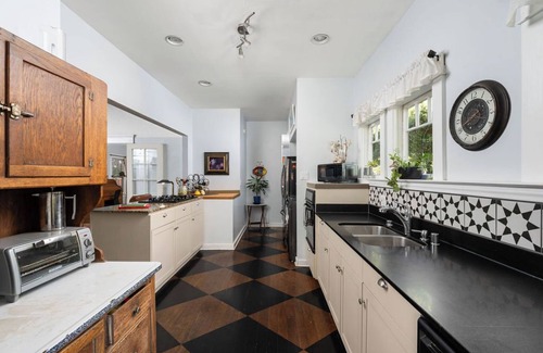 This apartment is spaciously away from all the downtown activities, but close enough to walk if you are up for it. We walk it often and appreciate being far enough away to get there, but away from the activity when we want to keep our distance. The bar and restaurant scene is our opinion the best in town, changing and growing all the time. This apartment was built in 1922. There have been some modification to the floor plan, but it still functions very well and it has been updated to include all necessary functionality. The oak flooring is original. The kitchen has granite and all the bells and whistles. It even has a bidet. This apartment is situated so there is access to the deck with a firepit, outside TV, comfortable seating, and even a putting green if you feel like moving around a bit. We offer one private bedroom with door that closes. The other bed is in the sunroom and is open to the kitchen. There is a sleep sofa in the living room. The bathroom has an old claw foot tub what is a great soak, as well as shower.