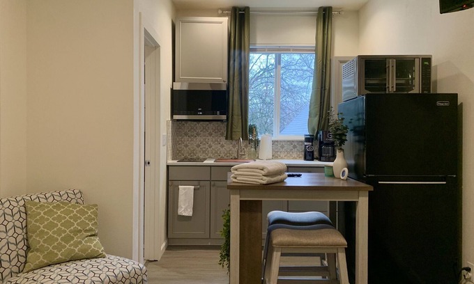 This cozy downtown studio that has everything you would need for a short stay in Moscow. This studio is located just two blocks from Main street. It is also an easy walk to the University Campus. The Studio is a completely private room including a kitchenette and private bathroom. There is a dining/work space along with a queen sized bed. Also included is a hot plate, toaster oven, fridge/freezer and kitchen items for basic meals. Think hotel room, but more homey.