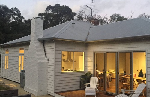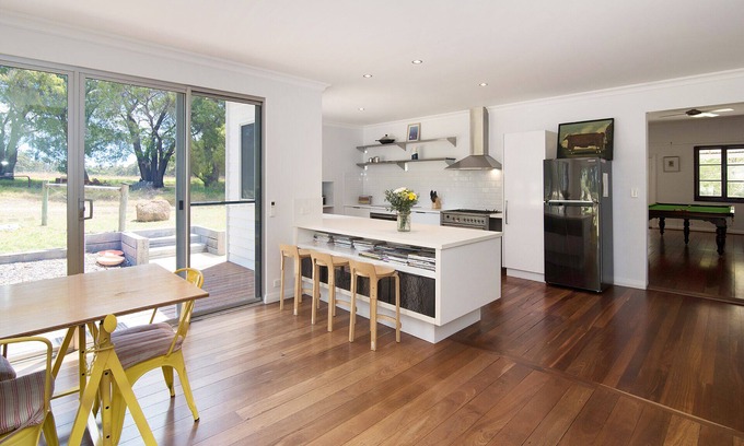 Dragonfly Escape is an original 'settler cottage' which has been completely renovated using natural materials to create a feeling of harmony with the natural setting in which it is found. Designed to be a home away from home, it is a perfect place to escape to in order to discover the Margaret River region and enjoy time with family and friends. Four bedrooms with high quality support mattresses , providing one king size bed, two queens, and three singles, can sleep a total of 9 people. A state-of-the-art kitchen is fully equipped with new European appliances, including both gas and electric ovens and a wood-fired Nectre baker's oven. The modern designed industrial/coastal look large bathroom has a shower and stand alone bath where you can also relax an afternoon or evening away. There is an outdoor hot/cold shower for after the beach and 2 WC in the house.