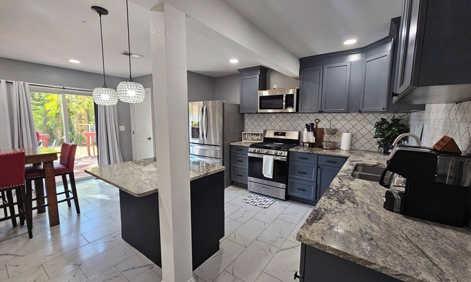The kitchen is AMAZING! Updated and stylish! Gas stovetop, microwave, coffeemaker and more. Stackable washer and dryer available in closet. Nice deck with charcoal grill. Large yard with firepit.