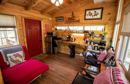 Escape to the trees and find peace, comfort, and outdoor fun at The Dreamweaver, a studio-style treehouse perfect for couples or solo travelers looking for a unique getaway in the Tennessee mountains. With a wrap-around porch that overlooks a serene wooded valley, this dog-friendly retreat offers the perfect blend of rustic charm and modern amenities—plus dogs stay free!