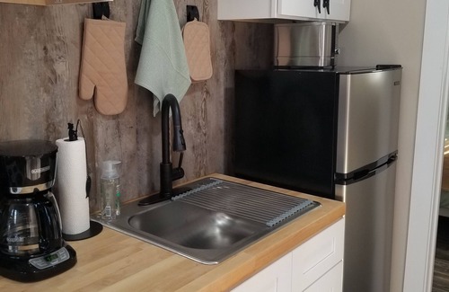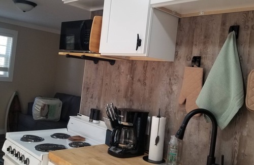 Inside, you'll find a fully stocked kitchen, complete with a stove, oven, refrigerator, microwave, coffee maker, toaster, and all the dishes and utensils you'll need to prepare delicious meals. Unwind in the living room or enjoy your meals at the dining table. The cabin also provides essentials like towels, basic soaps, a hair dryer, an iron and board, as well as air conditioning, heating, and linens to ensure your comfort.