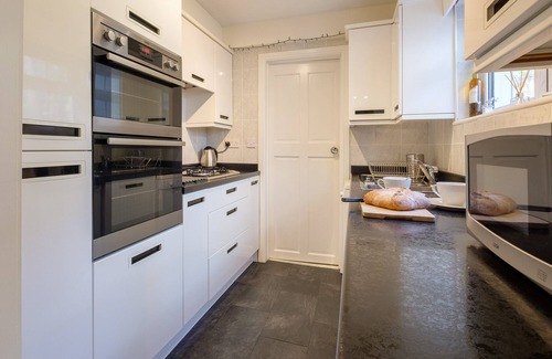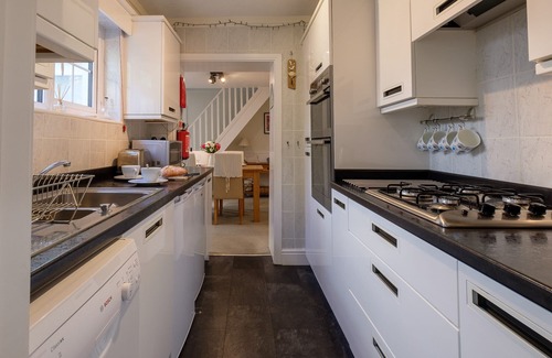 The kitchen is very well equipped with utensils and appliances including gas hob, double electric oven and grill, microwave, dishwasher, and separate fridge and freezer.