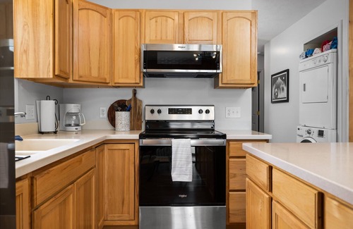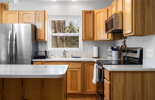 The open floor plan that connects the kitchen, dining area, and living room, make it easy to socialize with friends and family while you cook a meal on the new stainless appliances. There is a large dining table with ample space for up to 8 dinner guests, plus an island with additional seating. In the living room, you'll find tastefully appointed furniture that invites you to relax and unwind. Large windows offer picturesque views of the serene lake, providing a soothing backdrop to your stay.