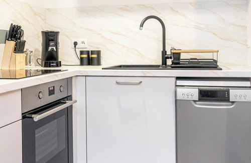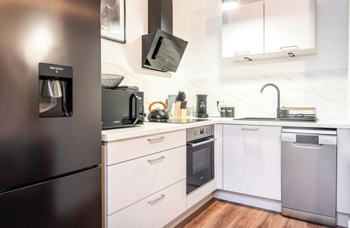 - Open-plan fitted and equipped kitchen, fridge, oven, dishwasher, toaster, kettle, coffee maker.