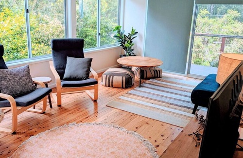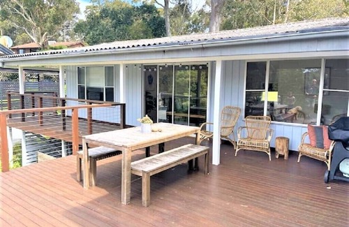 This beautiful house is only a 5 min walk to the beach and surf. Look no further if you are wanting a relaxing beach holiday with the family and fur baby. The house is very well equipped with all you need. Stylish & fresh, this relaxed coastal cottage offers the ultimate South Coast getaway. Ideal for families & friends, minutes walk to stunning beaches. An open plan with a huge deck and fabulous bush views.