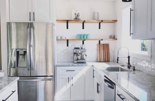 Spacious 4 bedroom house with 3.5 baths. This house has the ability to host multiple or large families. Two large king bedrooms downstairs with a living space and kitchenette. One queen and one twin (trundle) bedrooms upstairs with main kitchen and living space. Large deck upstairs with outdoor couches and dining table. Large fenced back yard perfect for your four legged friends. The back yard also has seating and a propane fueled fire pit.