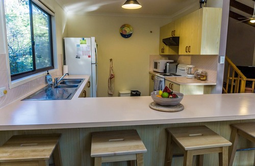This modern cedar home features a large open plan living area with a large deck off the lounge & also a deck off the dining area with a BBQ. It has a wood-burning heater, convection heating and ceiling fans for cool summer evenings and cozy winter nights.