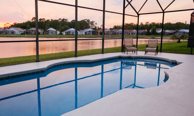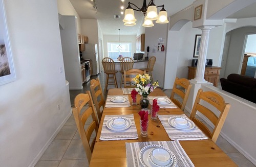 Guests are sure to enjoy a memorable vacation in this fully furnished, 4 bedroom/2 bath house. The master bedroom has a king sized bed, while the remaining rooms are furnished with Queen and Twin beds, comfortable for sleeping 8 people. The adjacent living room is furnished with a recliner, two couches, table and entertainment system . The kitchen is fully equipped for preparing meals and the dining room to sit down talk and eat. Situated on the larger lake at Eagle Pointe guests can enjoy an afternoon viewing the lake and later watch the sunset from the pool deck just off the living room. Spend the day away, enjoying nearby attractions such as Disney World, Universal, Sea World, Orlando Convention Center and much more.