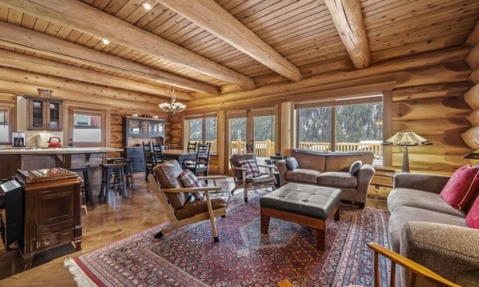 Eagle View Chalet is a beautifully maintained 3-bedroom/3-bathroom rustic retreat located at the corner of Fairways and Mountainview, offering stunning views of all the surrounding mountains.