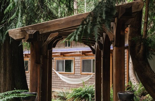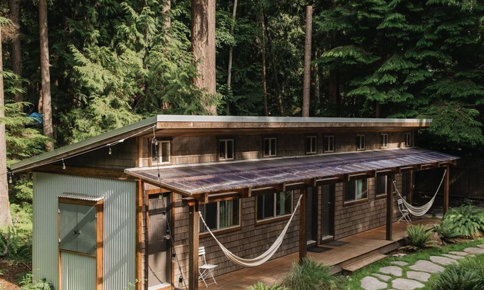Cozy bunkhouse nestled in the trees with a large open yard with hammocks and room to play. Huge communal kitchen, wood fired sauna, shared showers, propane BBQ, and just a 3 minute walk to mermaid beach.