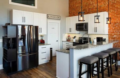 The loft feels spacious with over 1,300 sq. ft. interior with vaulted ceilings featuring one beautiful bedroom, a singular, fully-equipped bathroom, a modern kitchen, and tall windows overlooking Resort Street.