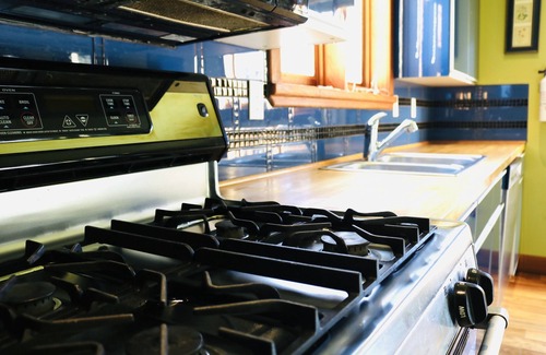 A full kitchen is all yours to use, including an island with chairs so you can sip wine with friends while creating your culinary masterpiece. We have two small decks on two different floors of the house and there's even a BBQ area off of the kitchen.