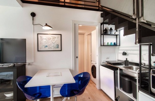 The bathroom has a modern shower and bidet, while the laundry room with washer-dryer allows you to comfortably manage your clothes during your stay.