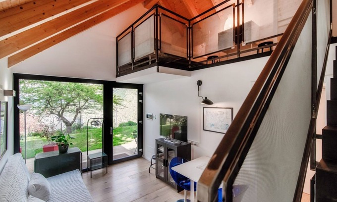 A large window overlooks the surrounding garden, offering a relaxing view and a feeling of continuity between indoor and outdoor spaces. Going up to the mezzanine, you will find a large double bed where you can rest during your nights.
