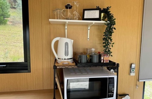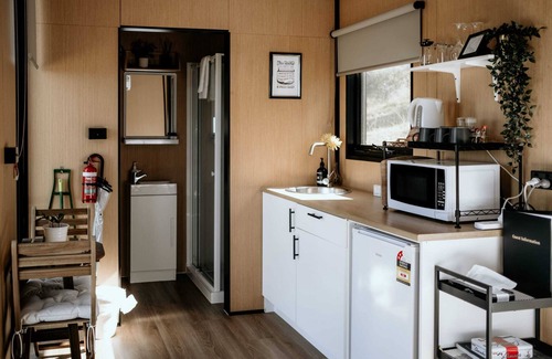 A cozy 139-square-foot tiny home and pet friendly accommodation with a queen-sized bed that sleeps 2 persons. Easy access to water, split air conditioning, a kitchenette, cooking equipment (e.g such as portable cooker, cookware, cooking utensils, cutlery, dishes & silverware), microwave, and a mini fridge. These include excellent bathroom facilities, such as a waterless eco-friendly compost toilet, hand basin, and shower (gas heated for hot showers) for your use.