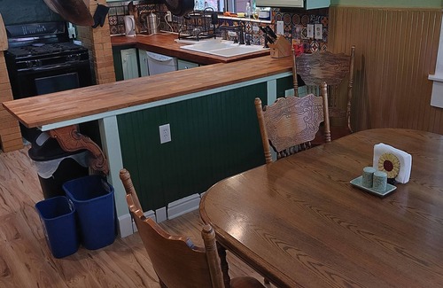 There are a couple of options for outdoor barbecues and lots of outdoor seating on the deck by the house and on the patio down by the river. Indoors we have two full-size living rooms in addition to the 3 bedrooms. The kitchen is large with a dining table that seats 8.