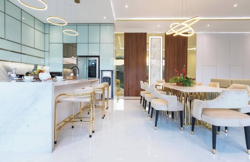 The villa has a sleek and contemporary design, with a dominant white color palette that blends perfectly with touches of brown and black, creating a chic and elegant atmosphere throughout. The living room and kitchen are very well designed, featuring beautiful lighting that enhances the villa's stylish ambiance.
