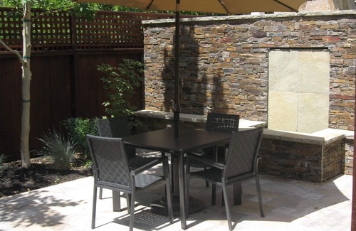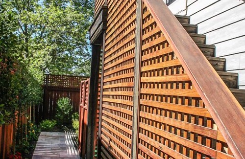 This air-conditioned apartment is very charming, private (no neighbors can see into the apartment), and includes high ceilings, a large bedroom with a king-size bed, large dresser, walk-in closet, and a nook with nice desk below a window, an elegantly furnished living room with a comfortable queen-size sofa bed, a well-equipped gourmet kitchen and a closet off the hallway with new washing machine and new gas dryer. The bathroom has a vanity and a glass-walled shower over a tub. Two 4K TVs (one in the living room and one in the bedroom), Alexa, high-speed WiFi and bi-weekly housecleaning are included. The apartment has a very private, nicely landscaped patio with a table for 4 persons, a large market umbrella with lighting, and a gas BBQ. A one-car garage is included and located directly below the apartment..
