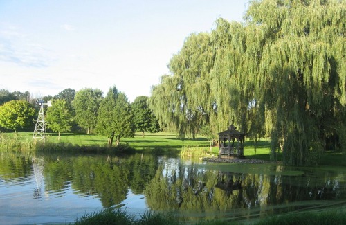 The lodge has two bedroom , one queen and one full sized bed (plus a queen hide-a-bed), a full kitchen, bathroom with shower, and a large great room which contains ample comfortable seating, a TV, piano, and a dining table that can comfortably seat 10. It is decorated with beautiful antique furniture, chandeliers, and it warmly welcomes all who enter. The fully furnished loft bedroom provides a magnificent overview of the great room below. Beautiful perennial gardens, flower beds and the pond afford a beautiful view no matter which direction you are looking. There is a porch/deck that runs the entire length of the north side of the lodge. It is equipped with comfortable outdoor furniture, a table and chairs and a gas grill. If needed, we can provide an air mattress for additional guests. The owners' home is located just down the brick path adjacent to the lodge, and will be available to assist in any way necessary.