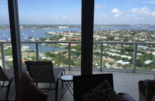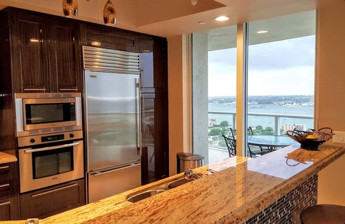 Enjoy spectacular inter-coastal views as you watch the action on the shimmering water from the 21st floor of this ultra luxurious condo. Dine al fresco or enjoy spectacular sunsets and beautiful moonlit nights from the 500 sq. ft. balcony. This spacious 2250 sq. ft. condo (including the terrace) has been professionally furnished with every amenity to provide maximum comfort. The 2 bedrooms(each with king size bed) and additional guests can be comfortably accommodated on the queen size sleeper sofa (with inner spring mattress) in the living room. The unit has 2 full bathrooms plus powder room. The large MBR suite has a whirlpool tub in its spa-like bathroom. Unit has a gourmet kitchen with custom cabinets, granite counter tops and top of the line Bosch appliances and a Sub-Zero refrigerator. The kitchen, living room, dining area, den, and both bedrooms have direct access to the large wrap around balcony. You can dine out and also relax on the chaise lounge chairs as you take in the spectacular vistas. There are 4 smart HDTV's in this unit. The onsite restaurant provides poolside service.