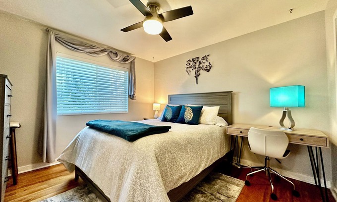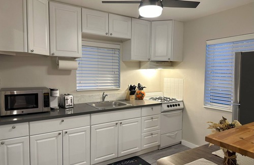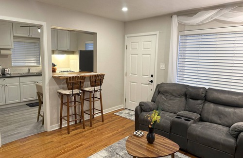 Experience the magic of Reno at our completely renovated one bedroom, one bath, 600 sqft home, perfect for 1 or 2 people. One block from UNR and a short walk to downtown casinos. Includes a comfortable family room with leather recliners, two 55" Smart TVs, fully equipped kitchen, ottoman that pulls out into a single futon bed, and a peak of the downtown lights! The primary bedroom includes an incredibly comfortable Queen size Stearns & Foster mattress with high thread count linens and a Hunter Fan. The rest of the house includes a fully equipped kitchen with quartzite countertops, separate laundry room with full sized Maytag washer/dryer and private side yard with Weber gas grill and patio table. Kitchen has a gas oven/stove, microwave & fridge. This is the front unit of a duplex with a private entrance. The 2 car driveway is shared with the tenant in the back, one space ea. Street parking also available. Max Persons 2.