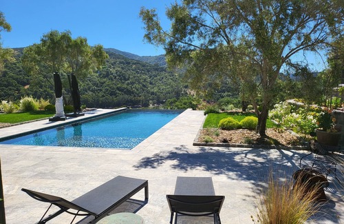 Escape to this fantastic chalet just moments from downtown Los Gatos. This 1-bedroom retreat features two cozy murphy beds, 1.5 bathrooms (outdoor walkin shower w/heater) with modern amenities (heated floors, air-conditioning, kitchenette with all the bells n whistles), adjacent to the glass bottom infinity pool (seasonal) & hot tub. Surrounded by wisteria arbors, fruit trees and vineyards, this tranquil atmosphere is the perfect landing spot to grab a book, your favorite hot beverage and relax. Guests can enjoy the beautiful surroundings, take advantage of the WiFi, and enjoy the 5+ acres of trails within the gated estate. Make yourself at home in this charming hideaway and experience the ultimate relaxation. Enjoy all that Los Gatos has to offer when you stay at this charming Tuscan estate.