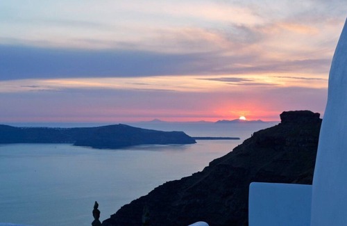 As part of our three-villa complex, you'll experience an unspoiled and private setting, allowing you to fully unwind and relax while enjoying the utmost privacy. All our villas offer striking, unobstructed views of the volcano, Skaros Rock, and the magical sunset. Despite our peaceful location, we're just a short drive away from the main town Fira and a mere 10 minutes from Oia village.