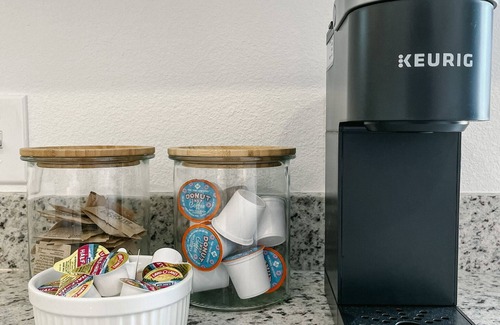 Professionally designed, the space features polished concrete floors, a queen-sized bed, a modern kitchen with stovetop and complimentary coffee, a dining table, fast wifi, a 40" TV, loveseat, private back patio, and a sleek bathroom.