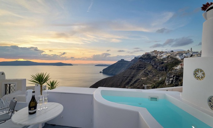 The elegant two-bedroom duplex has the perfect location on the Caldera Cliffs, right in the middle of Fira, and offers a spectacular view of the most famous sunset. This property consists of two suites connected to a private yard with a swimming pool and an outdoor jacuzzi with Caldera views.