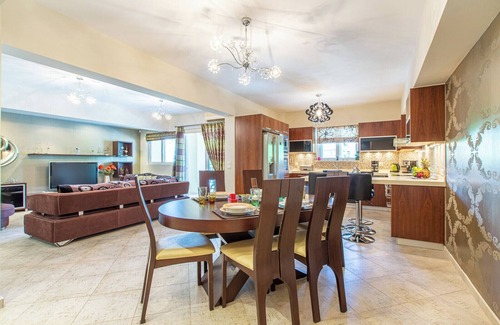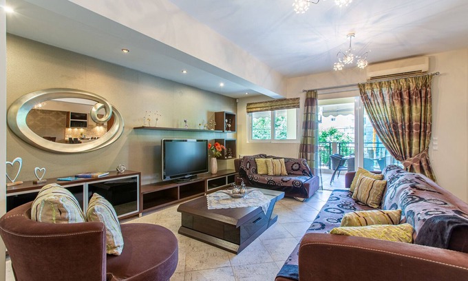 Elena Apartmentis a cozy apartment of about 130 sqm and it offers an open plan living room with a Smart TV, a dining area and a fully equipped kitchen as well as a city view balcony with an outdoor dining table.