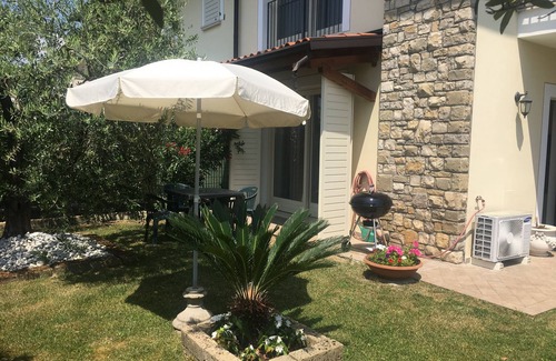 Two-room apartment on the ground floor, with large outdoor garden, composed of a double bedroom, living room with dining table and double sofa bed, kitchen, bathroom with shower, laundry and parking in the garage, the area is a short walk from the historic center of the village, with all services within walking distance, the lake is less than a kilometer away.