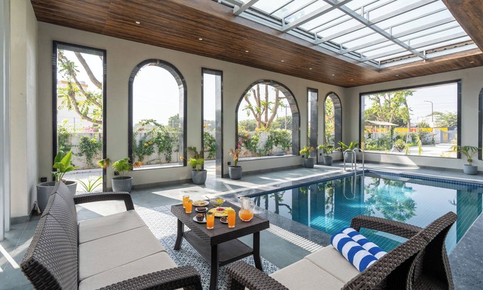 Best-rates for the Jaipur District villa starts from $120 per night with includes TV, Entertainment, Internet, Kitchen, Laundry, Parking, Balcony/Terrace, Sports/Activities, Bedding/Linens, Wellness Facilities, Guest Services, Barbecue/Outdoor Cooking, Child Friendly, Pool With all other amenities. Float Homes offers a wide range of floating homes, houseboats, and water chalets, ensuring each traveler finds their ideal water escape, whether planning a water getaway, a family vacation, or a pet-friendly retreat with the whole group.